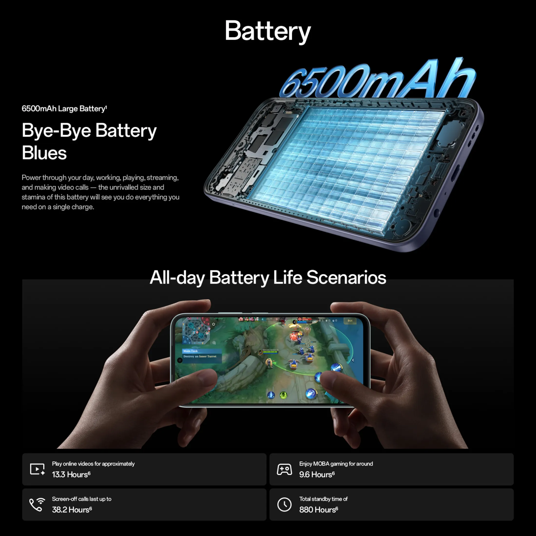 . A massive 6500mAh battery provides long usage between charges
