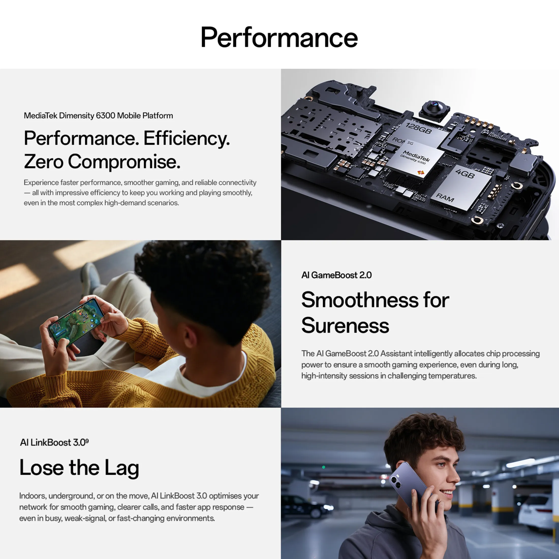 . Under the hood is a MediaTek Dimensity 6300 chipset (8-core) paired with 4GB of RAM and 128GB of internal storage