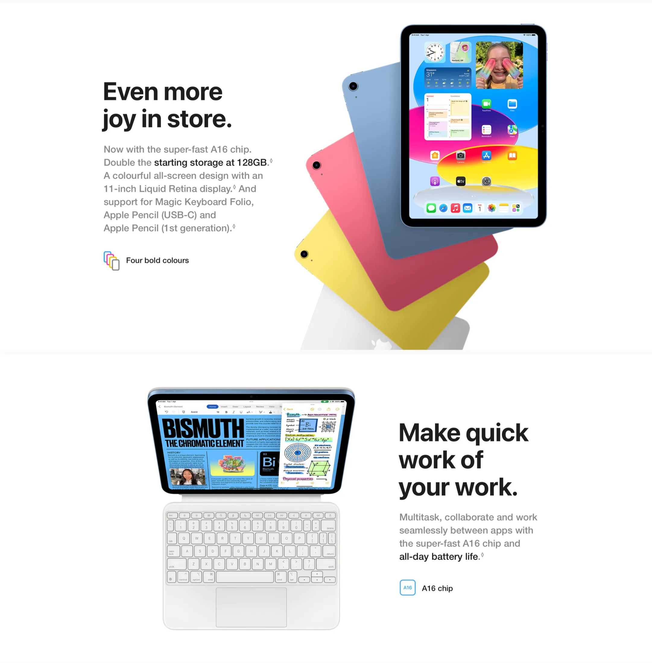 Available in Blue, Pink, Yellow, and Silver, the iPad 11th Gen offers storage tiers: