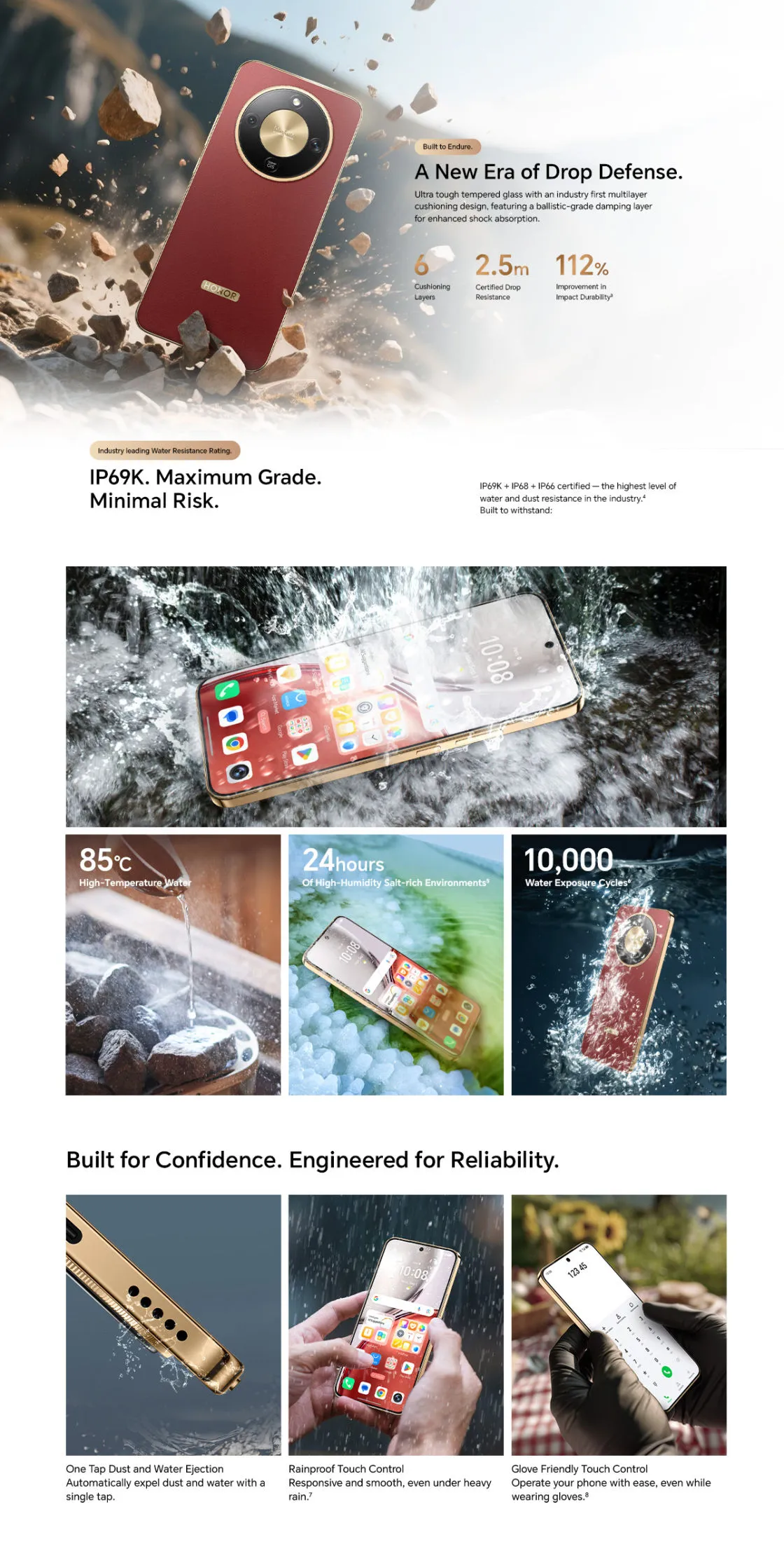 The Honor X9d 5G stands out with IP69K, making it one of the toughest phones in this segment (resistant to dust, water, and high-pressure jets).
