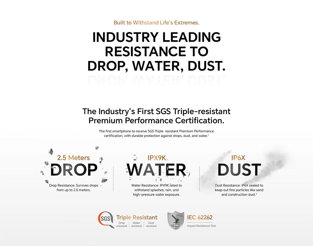 The X9c and Samsung A56 only offer IP67, enough for accidental splashes but not as rugged.